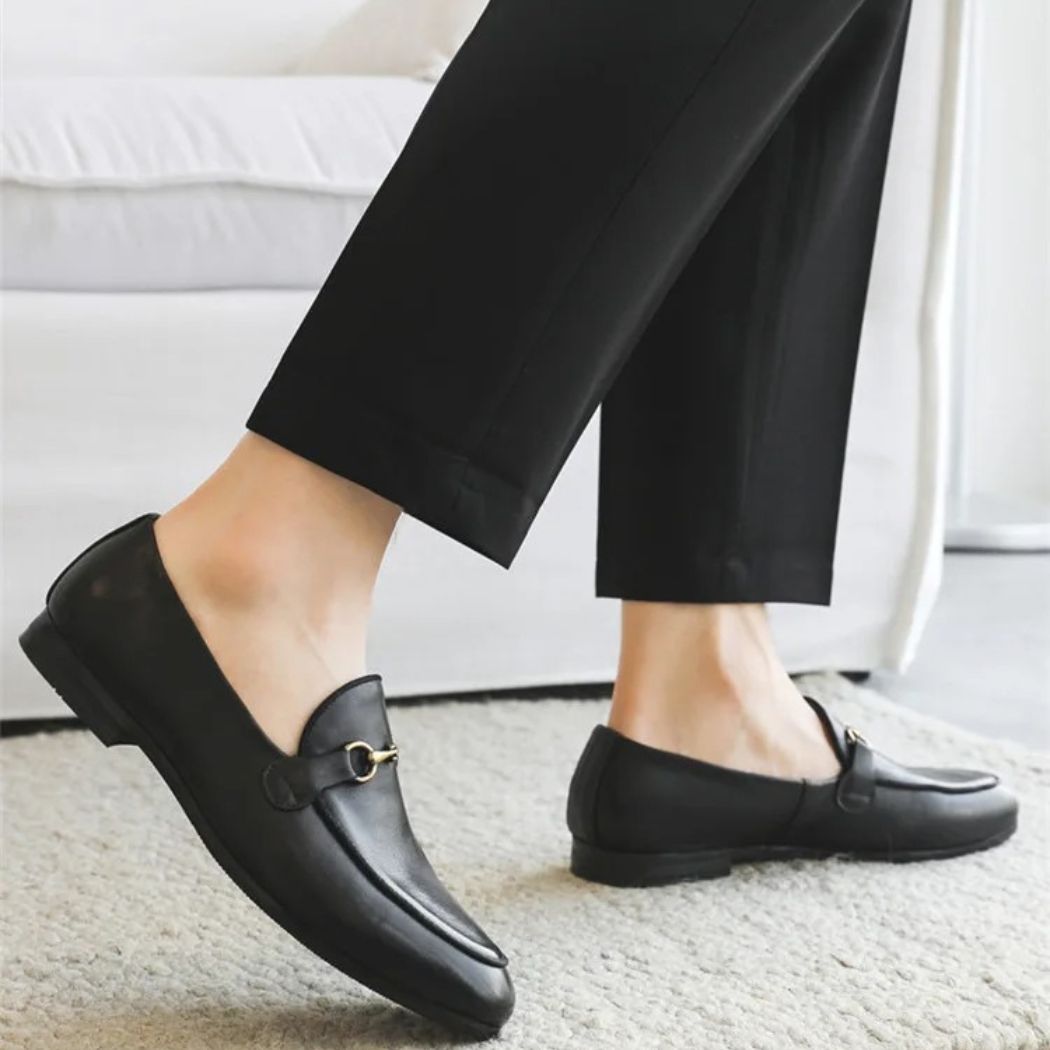 Il mocassino nero con fibbia dorata è la perfetta incarnazione di un’eleganza classica e senza tempo. Ispirato ai famosi modelli di Ferragamo, questo mocassino presenta una sottile e lussuosa fibbia dorata che aggiunge un tocco di sobria raffinatezza.